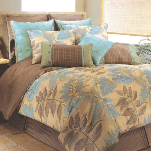 The Capri four piece comforter set is a beautiful transitional woven leaf pattern jacquard The comforter measures 110x96 the shams 20x36 and the bed skirt is 78x80x17 Luxurious Comforter Oversized Comforter Tropical theme Reversable Machine washable